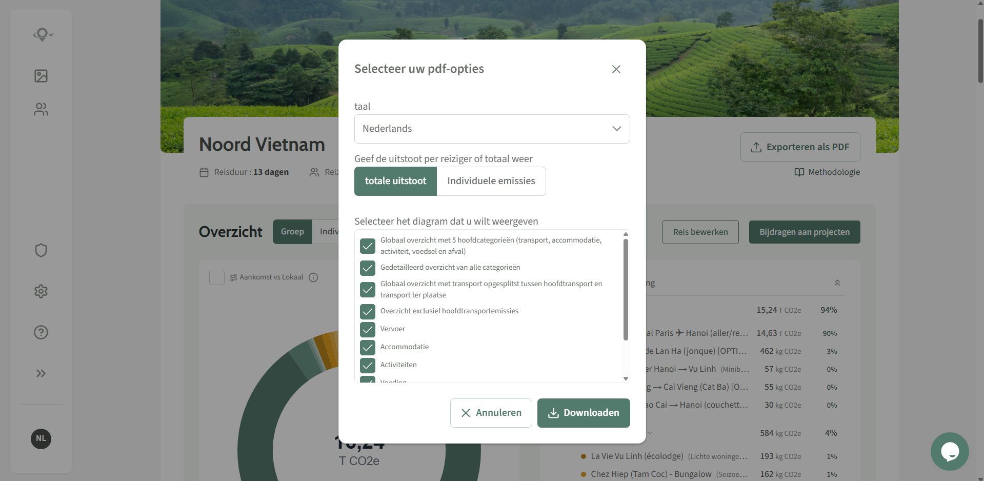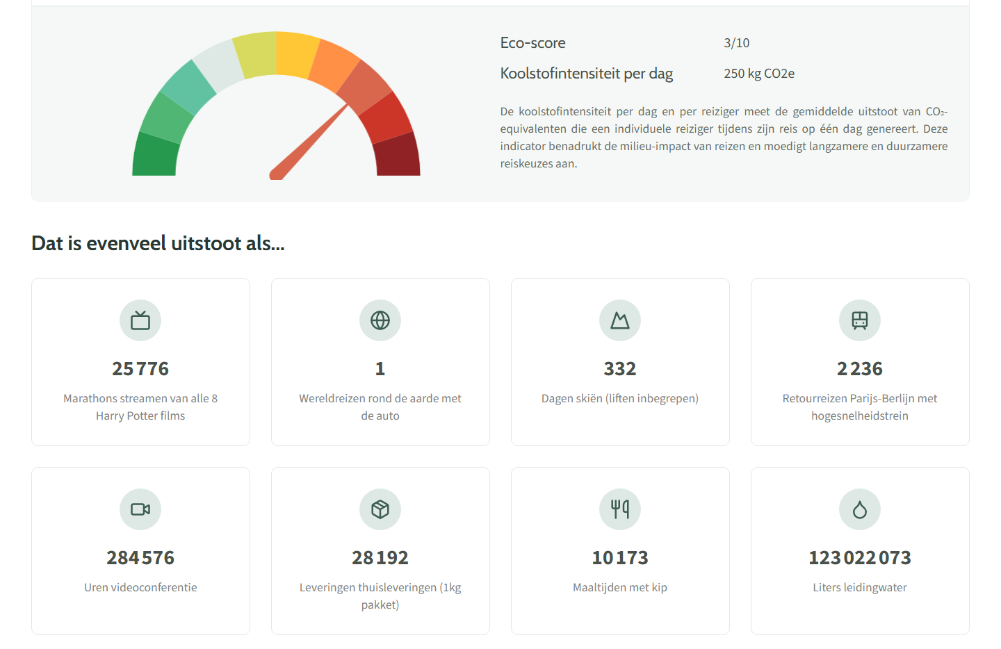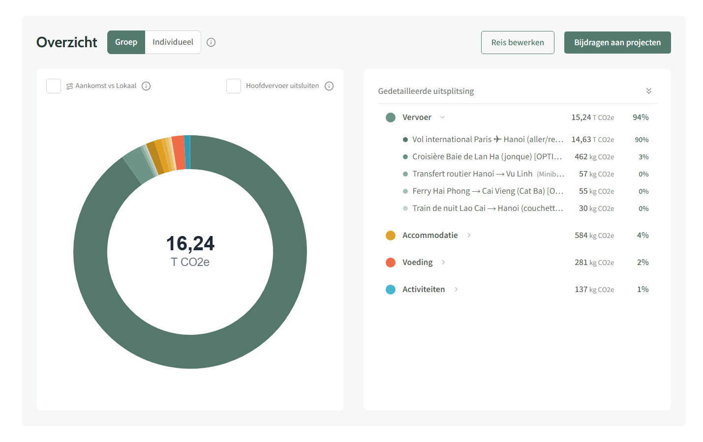 Zet een reisaanbod in slechts een paar klikken om in een gedetailleerd impactrapport met grafieken. Je krijgt ook toegang tot een dashboard om de impact van verschillende reizen te vergelijken, en je bijdragen aan de klimaatprojecten van jouw keuze te volgen.